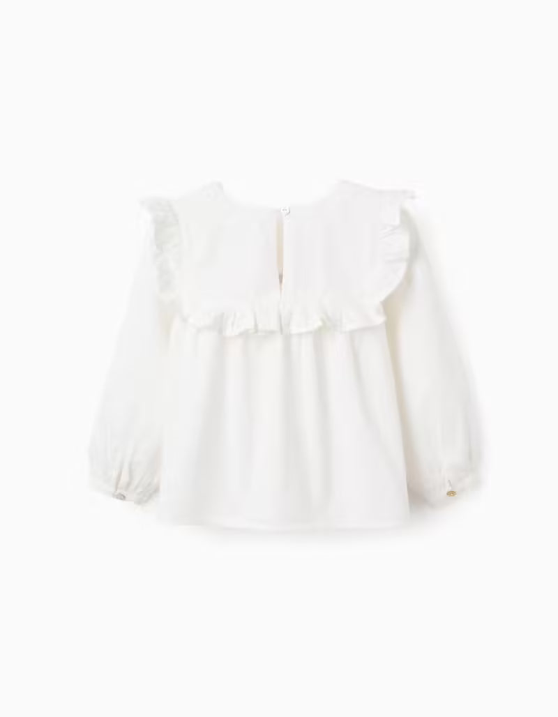 Blusa de manga larga, 100 % algodón. Con volantes y bordado floral en el pecho. Botones en la espalda y los puños. Corte evasé, amplio y fluido. Color: blanco.