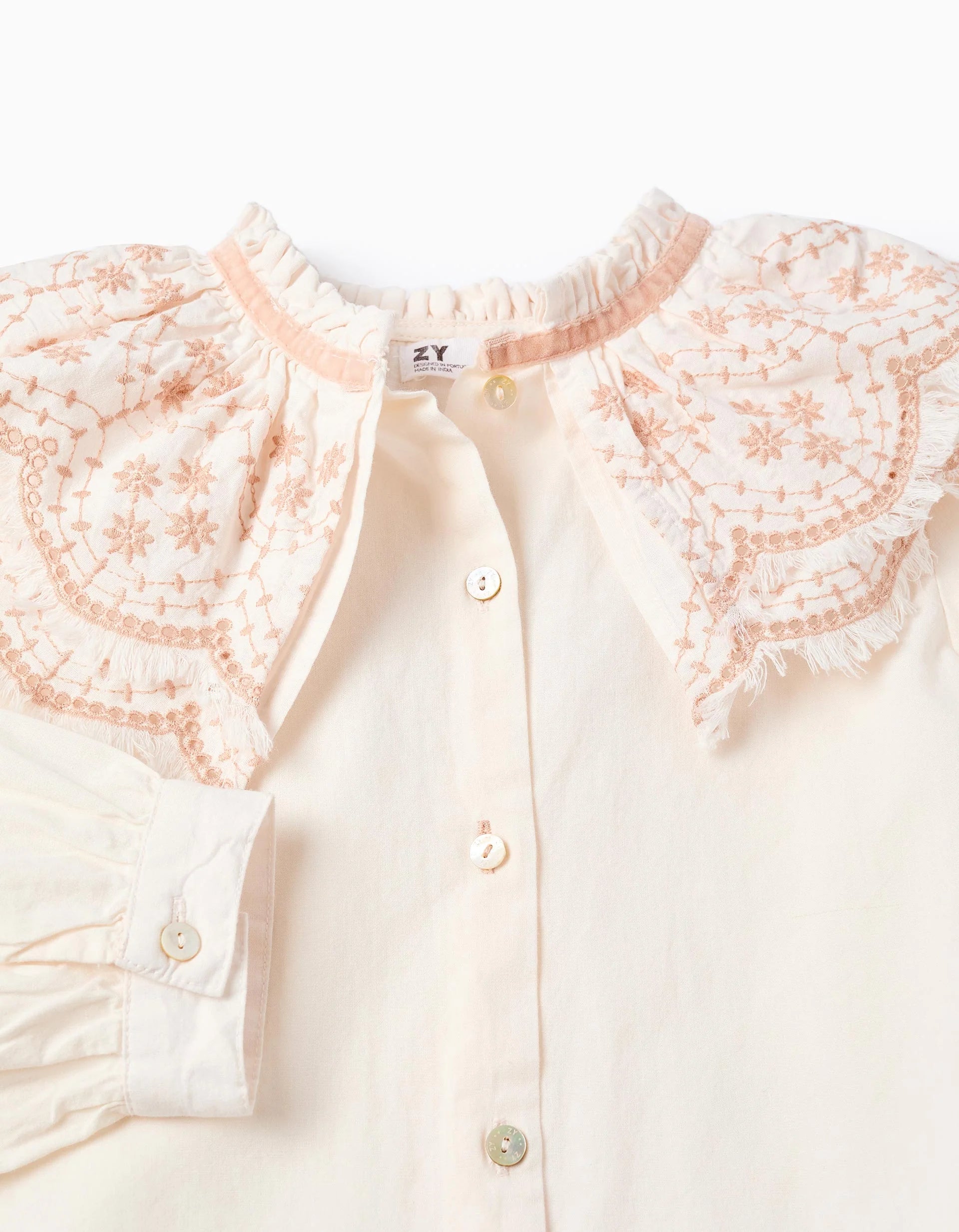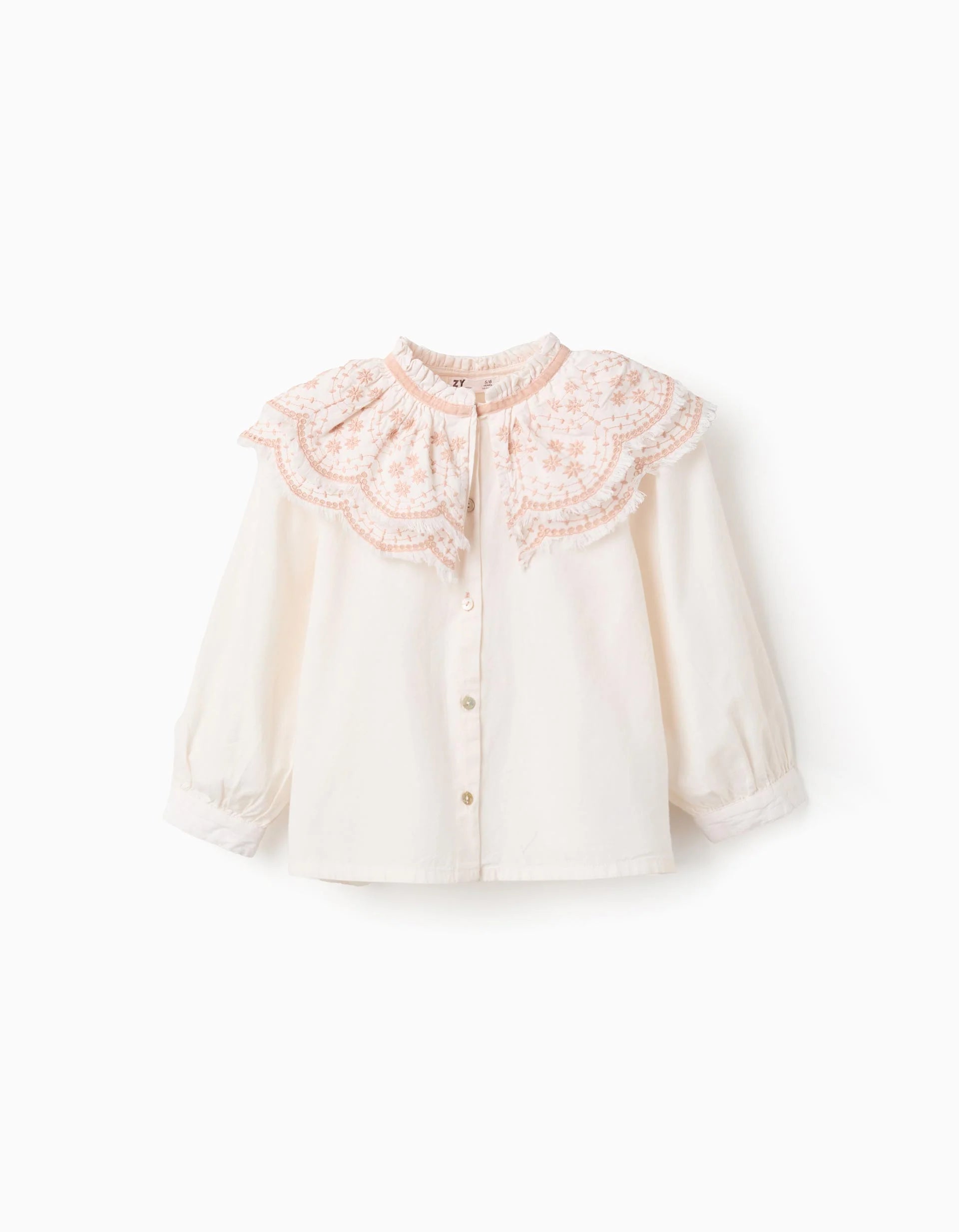 Blusa blanca de manga larga, perfecta para las niñas que aman un toque de elegancia en su día a día. Confeccionada en popelina de algodón ligera y suave, esta prenda ofrece comodidad y libertad de movimientos esenciales para el juego. El cuello con volantes de doble capa, bordado con flores de color rosa claro y acabado deshilachado, le da un toque fashion, lo que la hace ideal para ocasiones festivas o una salida familiar al parque.