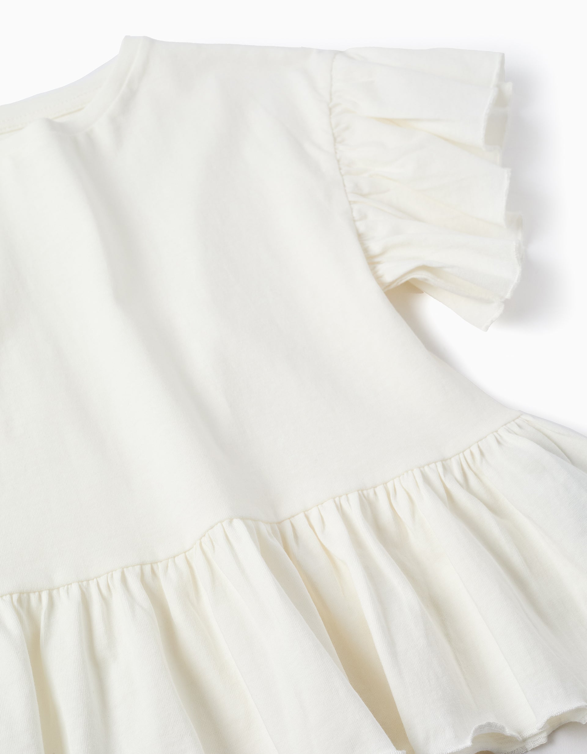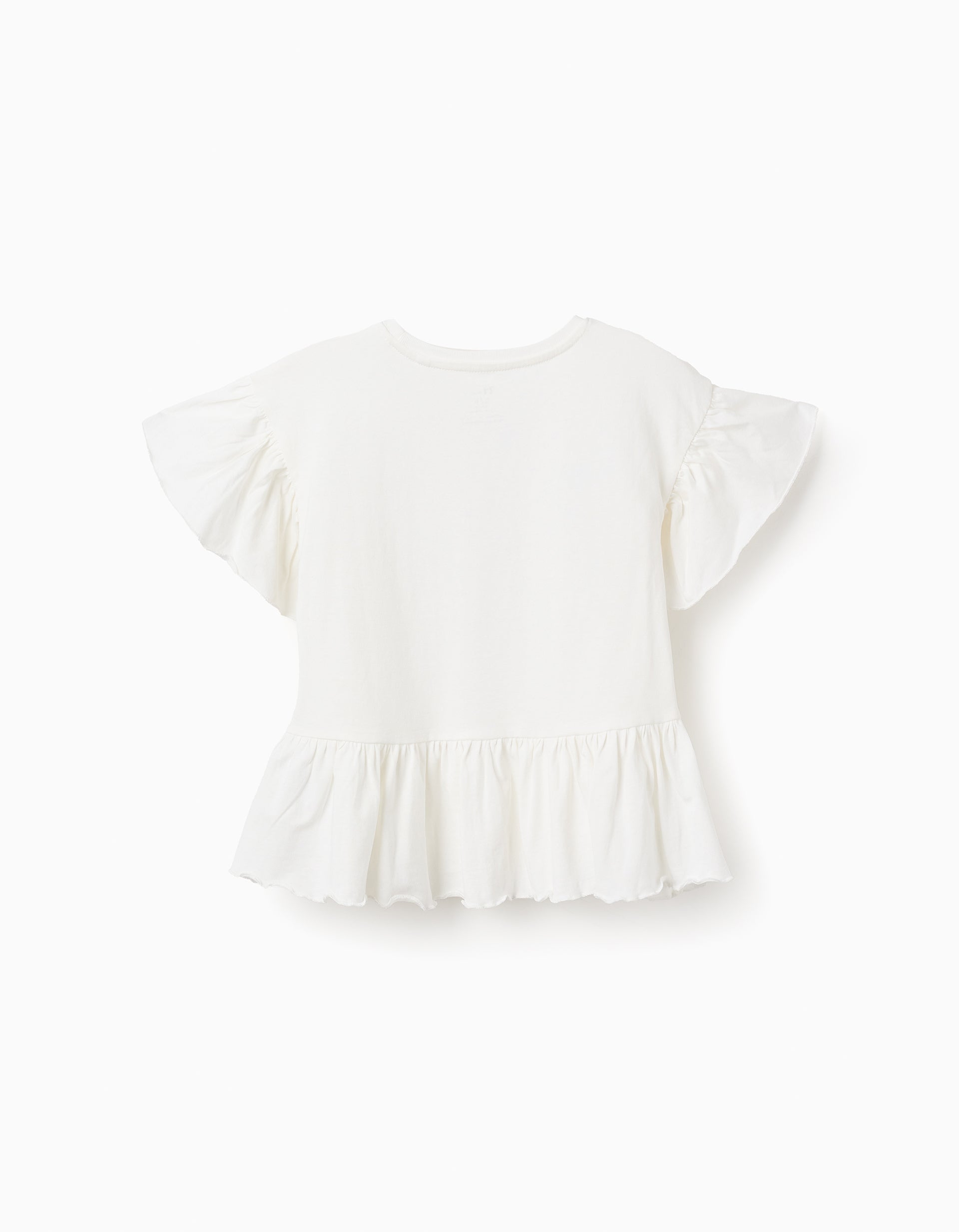 Camiseta blanca para niña, 100% algodón, con volantes en el bajo y en las mangas. Hombros con efecto caído. Etiqueta interior estampada para no irritar la piel. ¡Ideal para todos los estilos! We Care: artículo con certificado Oeko-Tex Standard 100, que garantiza la ausencia de sustancias nocivas o irritantes para la piel.