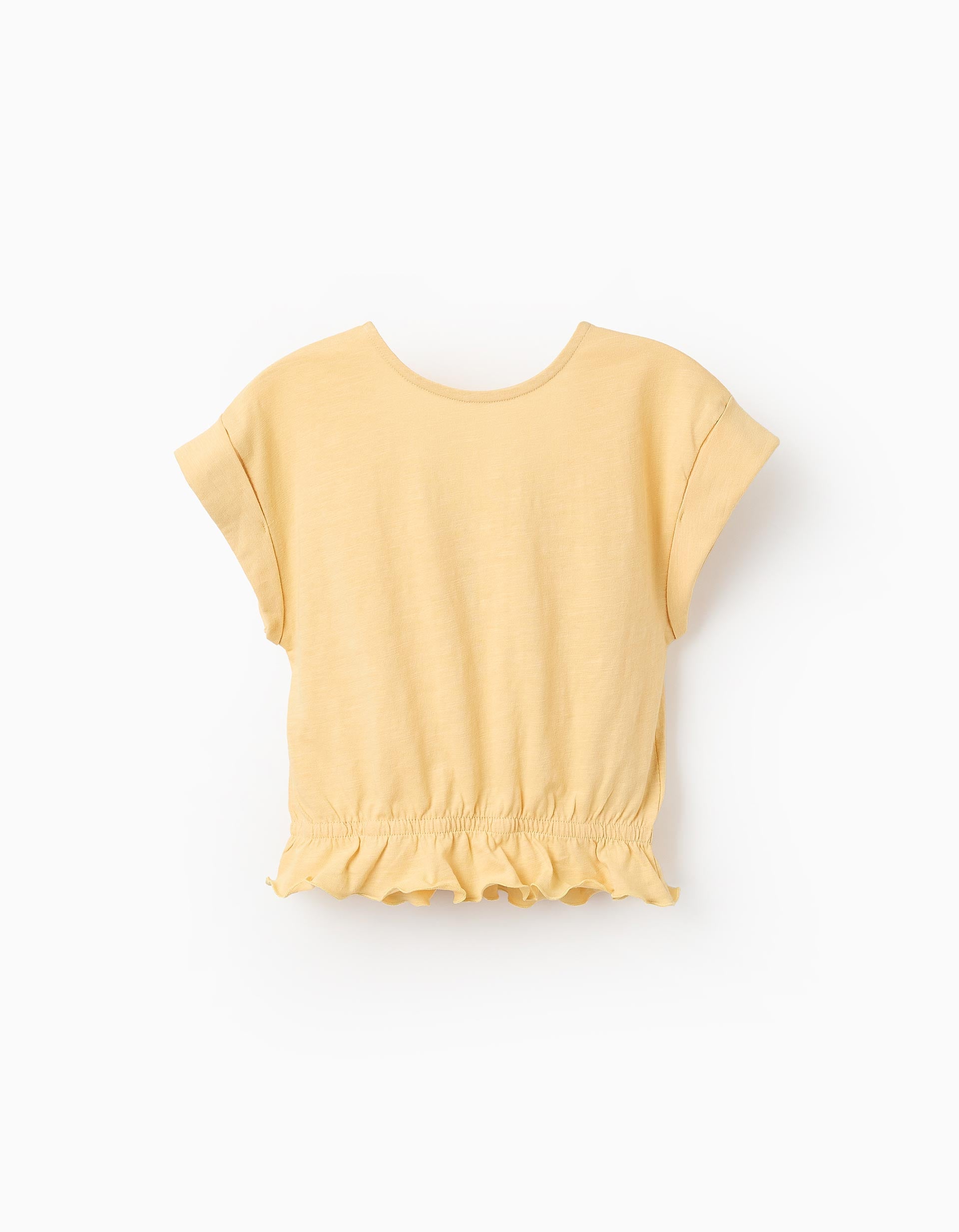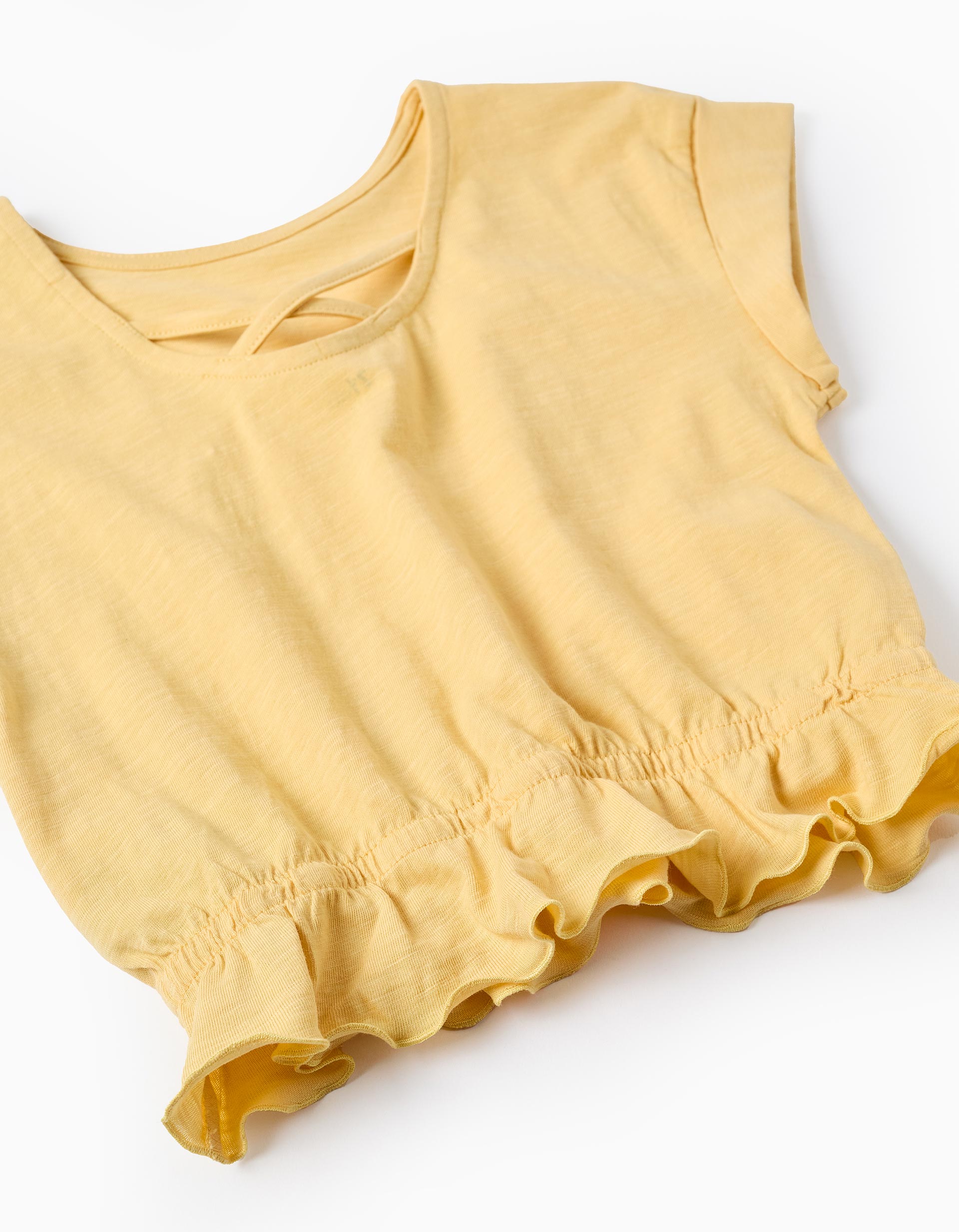 Camiseta amarilla para niña, 100% algodón. Mangas kimono. Base elástica, para un ajuste perfecto, y con volantes. Espalda semiabierta con detalle en cruz. Etiqueta interior estampada para no irritar la piel. ¡Para todos los estilos!