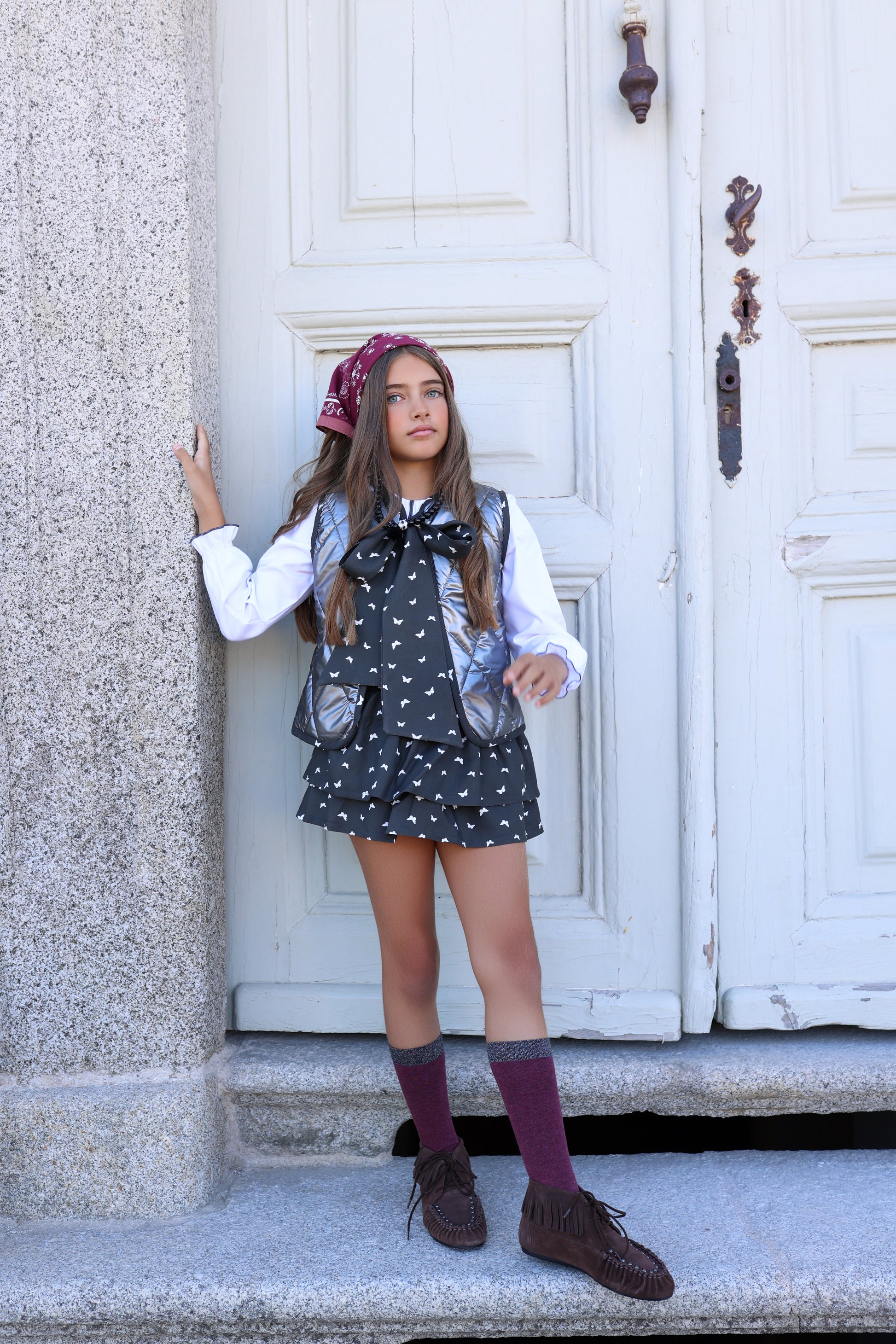 Chaleco acolchado en gris claro con acabado satinado. Ligero, cómodo y perfecto para combinar con los vestidos, faldas e incluso jesusuito de la colección Mariposas. Confeccionado en talleres españoles.