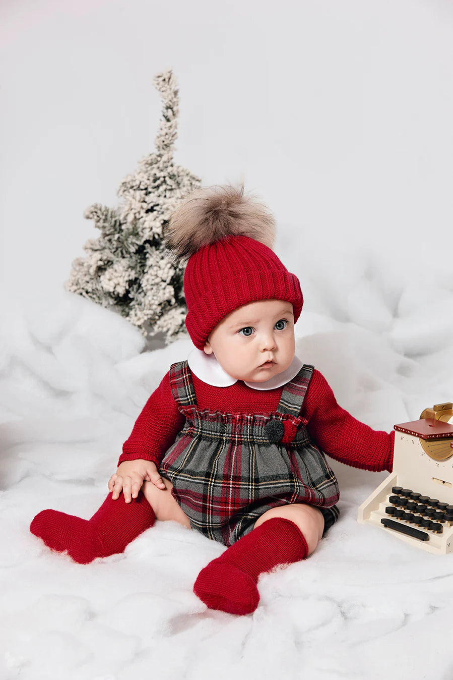 Pelele engomado de cuadros escoceses en tonos grises y rojos con tirantes a juego y detalle de pompones decorativos en la cintura y jersey de punto tricot rojo y cuello bebé de tela blanco.