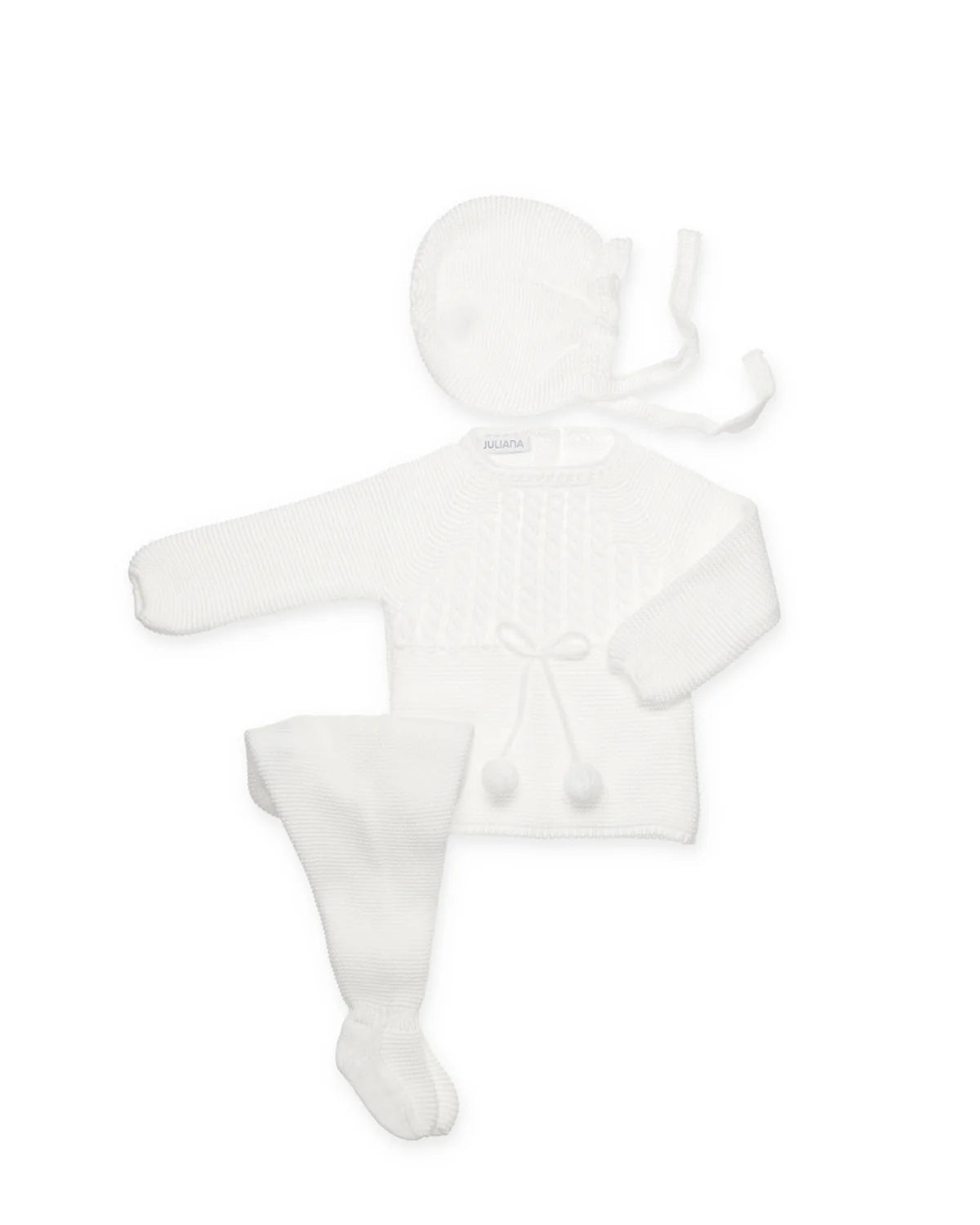Conjunto 3 piezas, jersey de punto con trenzas verticales y pasacintas decorativo con lazo. Cuello redondo sencillo. Acabado en mangas y bajo en canalé. Polaina y gorro básicos a juego. Color blanco.