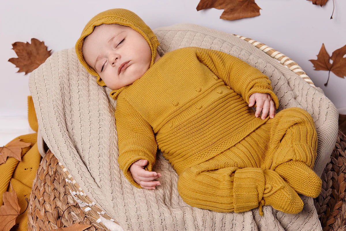 Jersey liso con canesú adornado con bodoques en punto. Cuello redondo sencillo. Polaina y gorro básicos a juego. Diseño elegante y sutil. Color mostaza.
