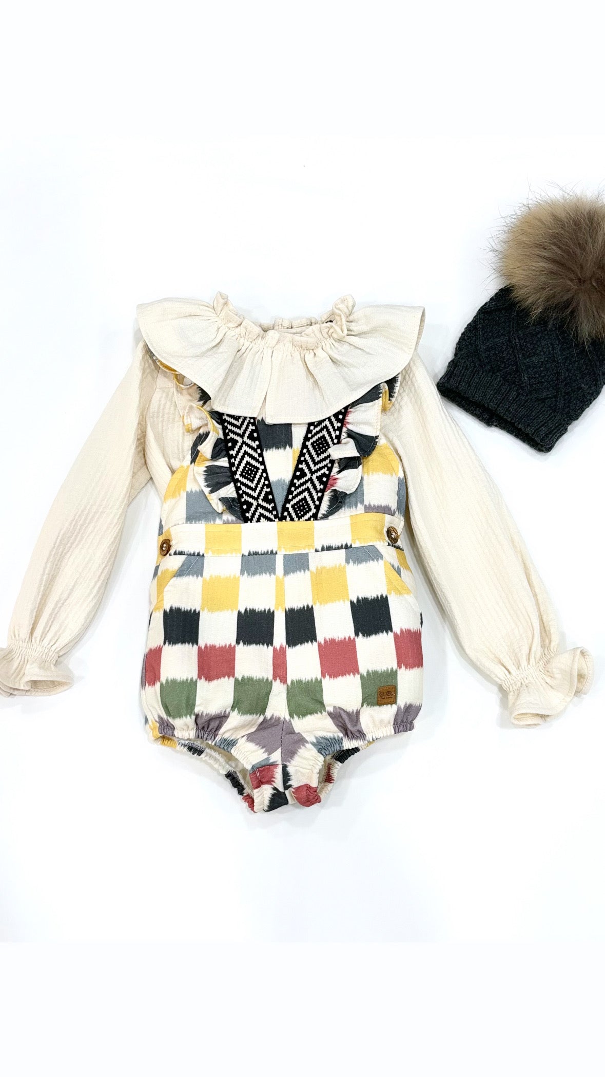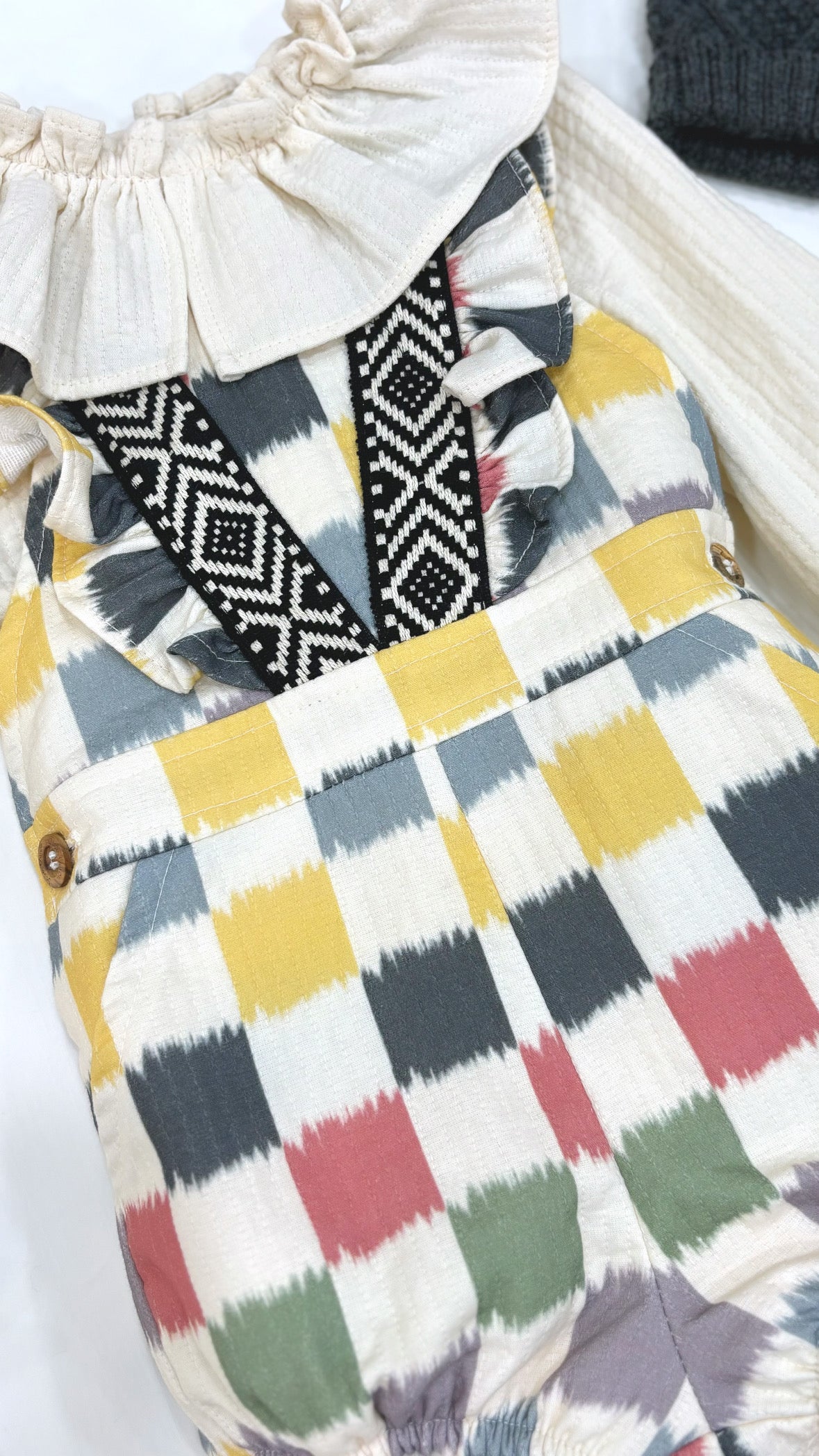Conjunto de peto estampado étnico blusa con cuello volante en color beig.