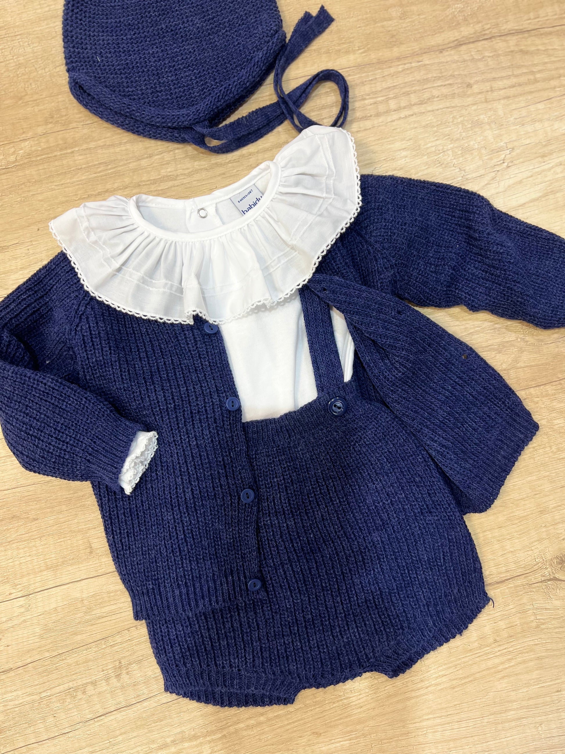 Conjunto niño de Paloma de la O, incluye peto y chaqueta punto al tono en azul.