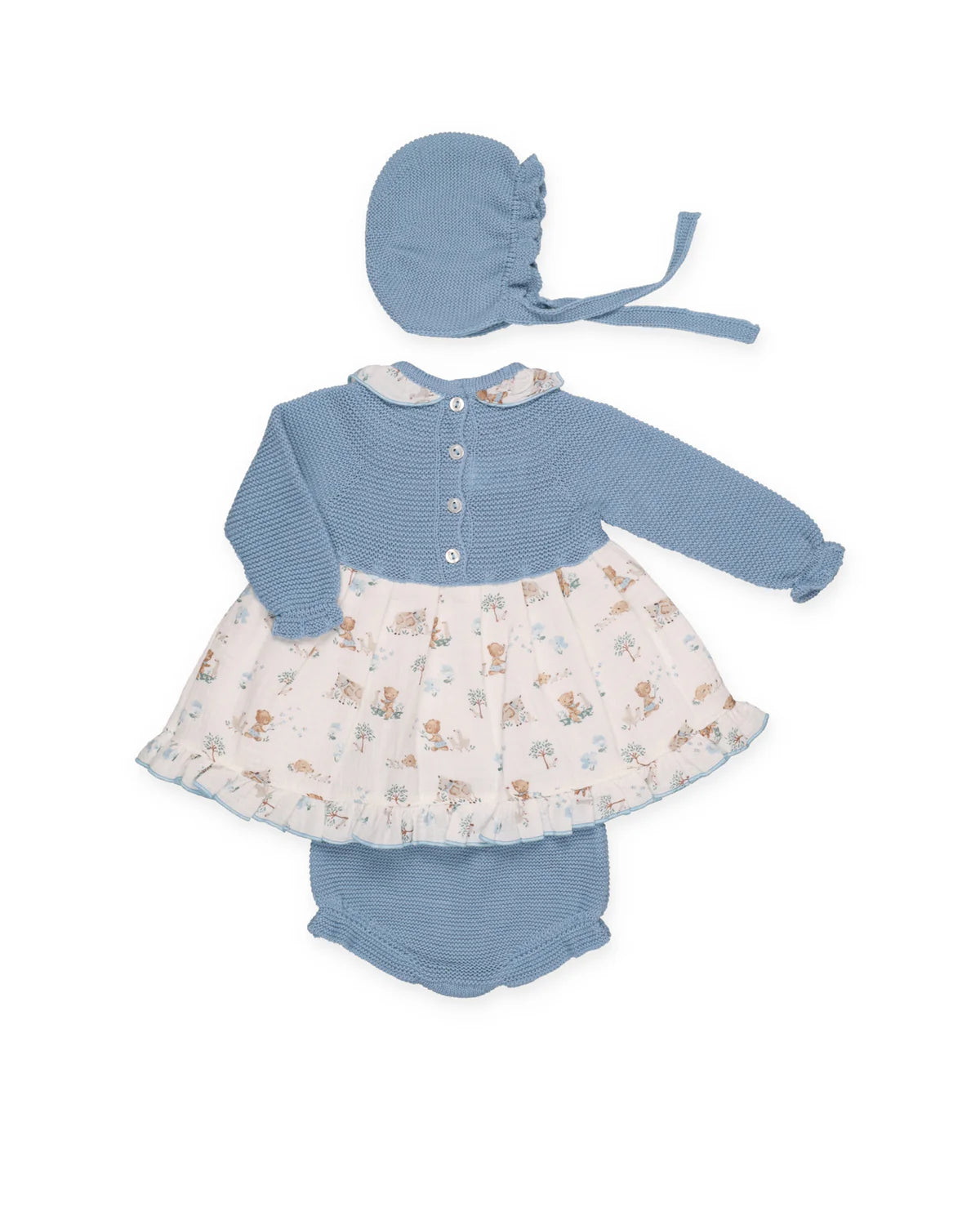 Jesusito con cuerpo de punto tricot y falda de tejido estampado con animalitos en tonos suaves. Cuello volante estampado a juego. Incluye ranita y gorro de punto.