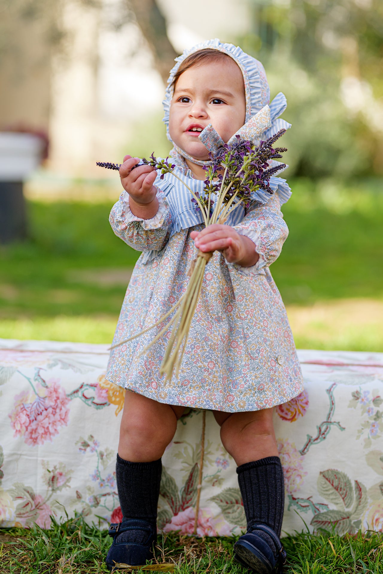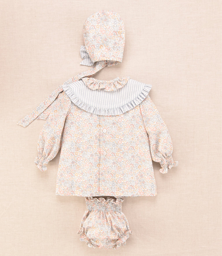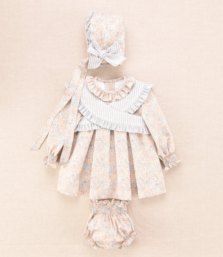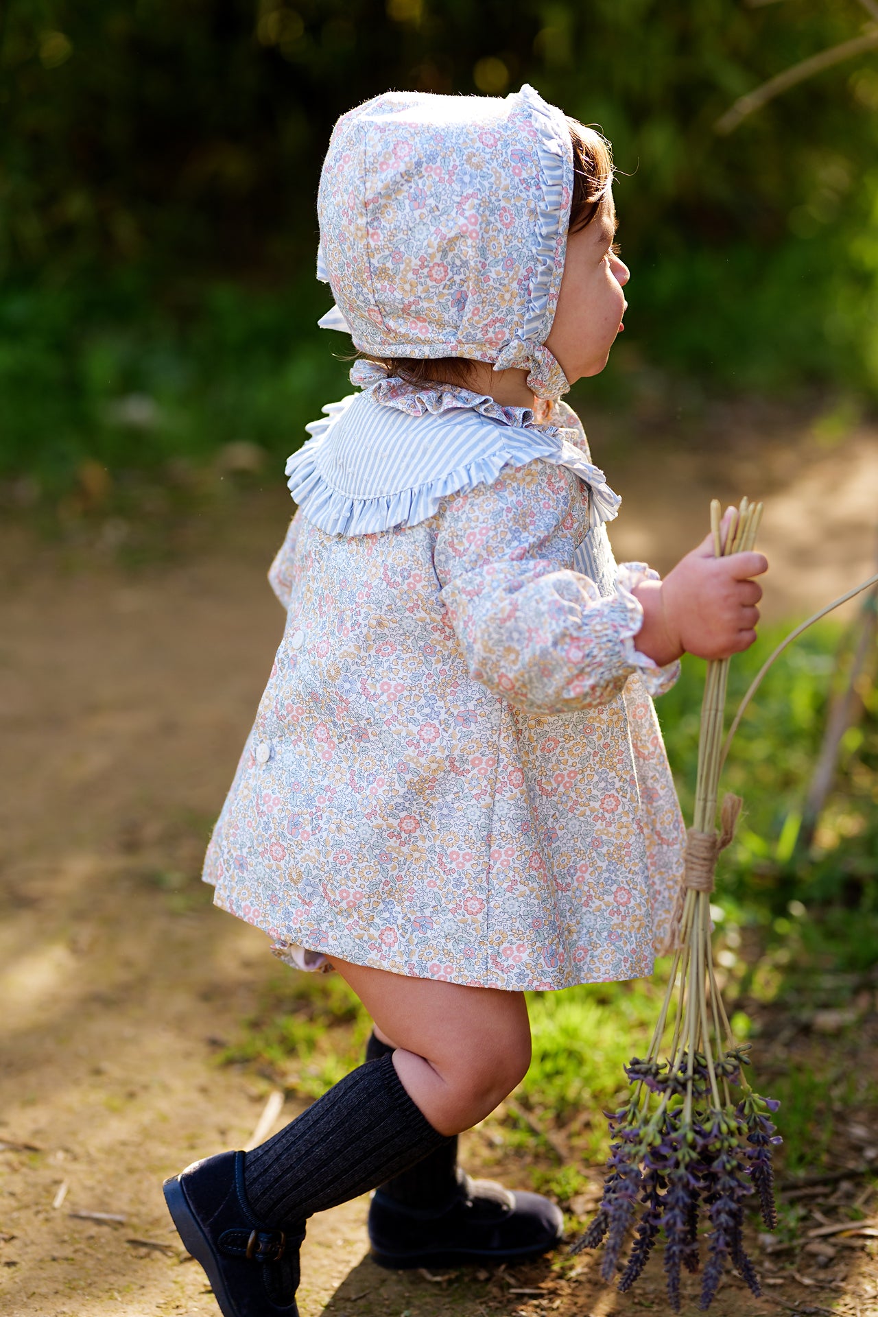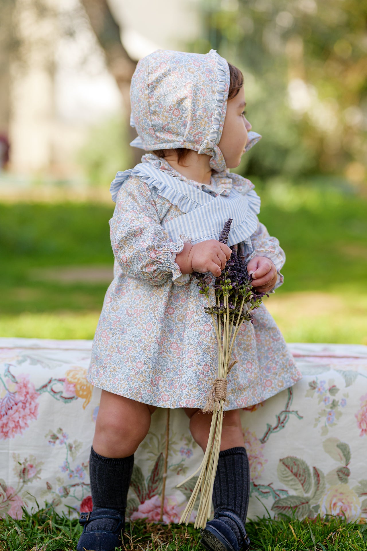 Jesusito estampado liberty, con detalle de cuello cruzado en rayas celestes, incluye braguita y capota.