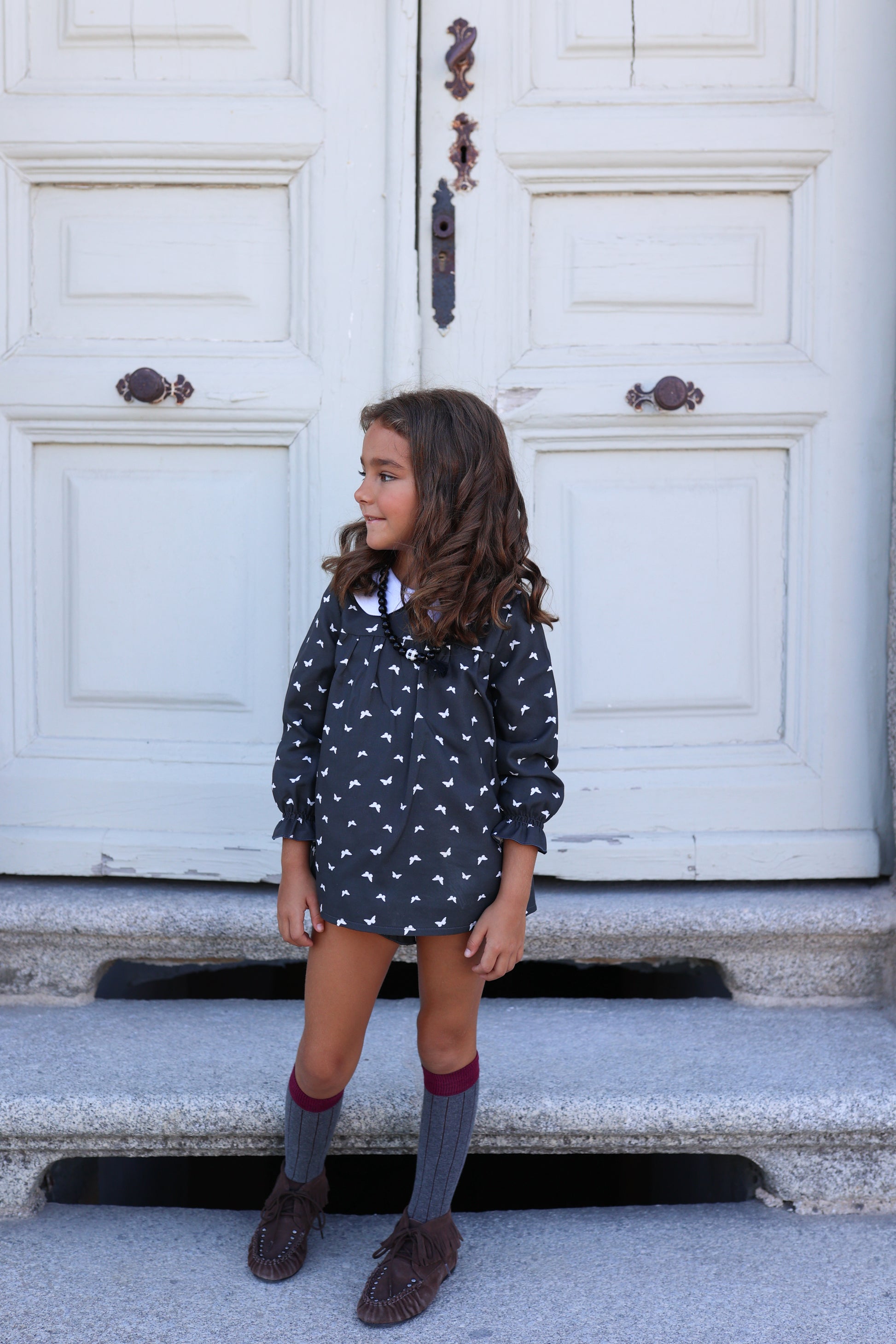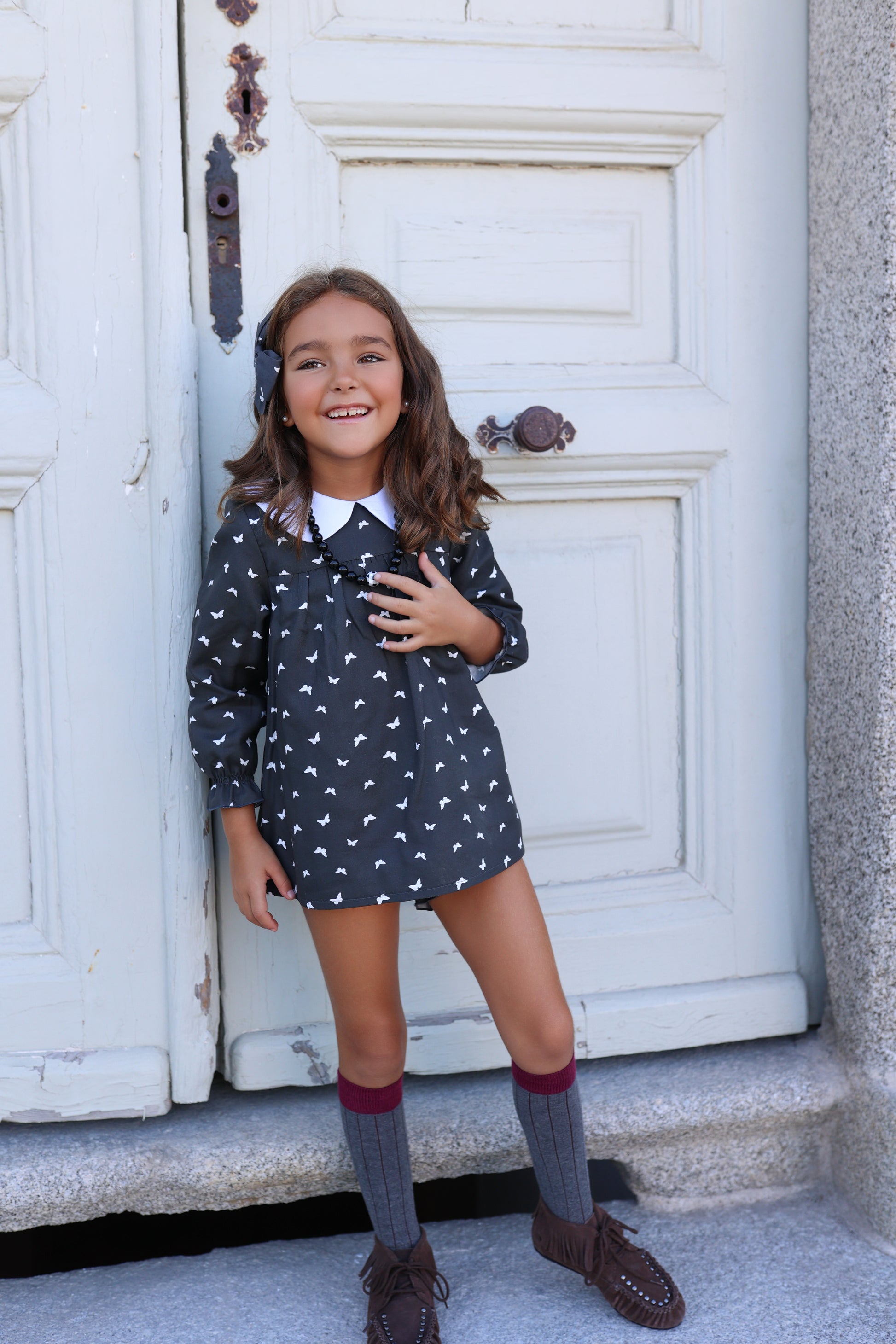 Jesusito infantil en tejido gris marengo con estampado exclusivo de mariposas blancas, diseñado por Kids Chocolate. Con cuello blanco redondeado y mangas abullonadas, es una prenda delicada, elegante y cómoda, perfecta para ocasiones especiales. Composición Española. 100% CO