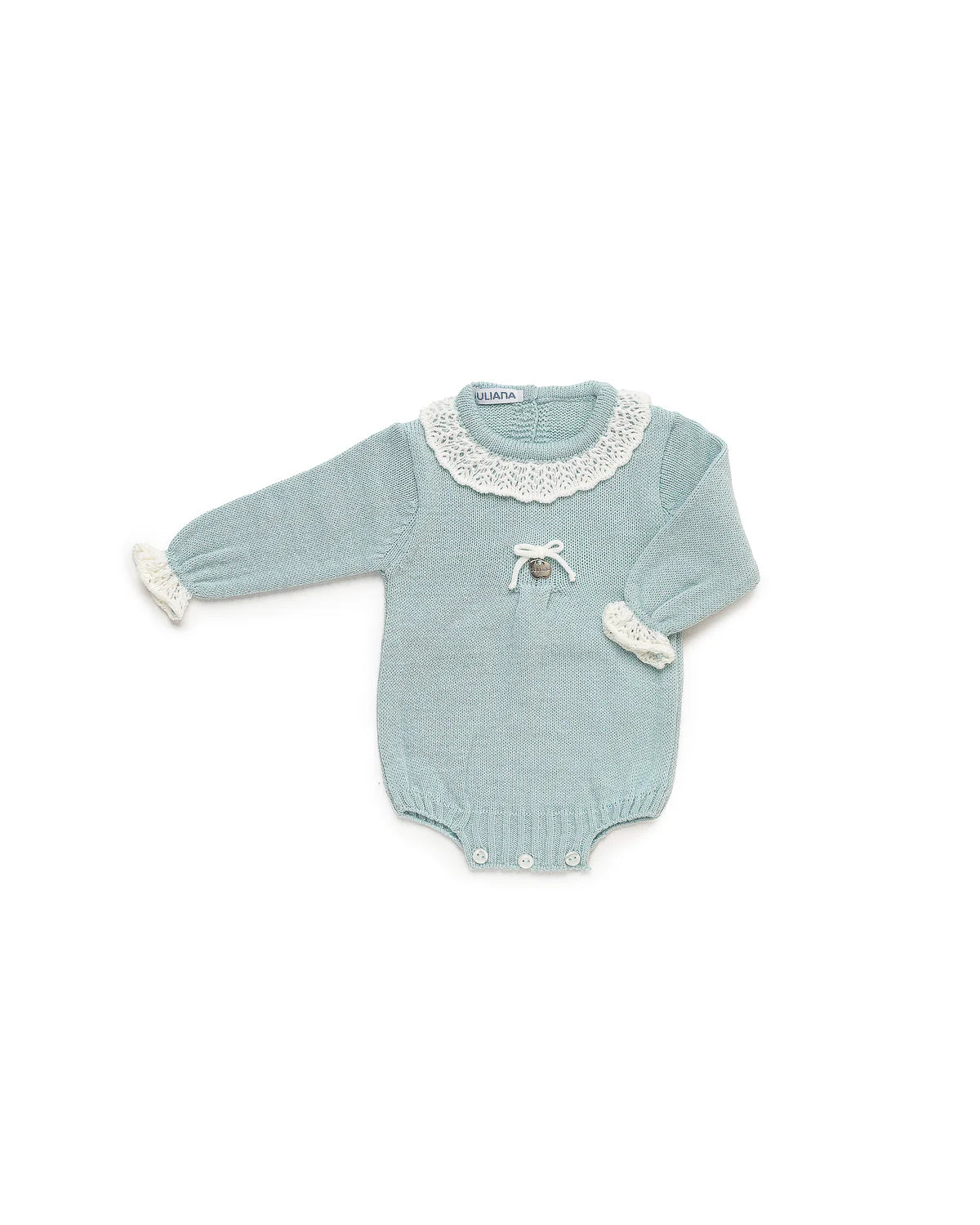 Pelele de manga larga confeccionado en punto tricot. Destaca su delicado cuello calado en crudo y los detalles de los puños. El lacito en el centro con pompón aporta un toque encantador. Cierre cómodo con botones en la parte inferior y espalda.
