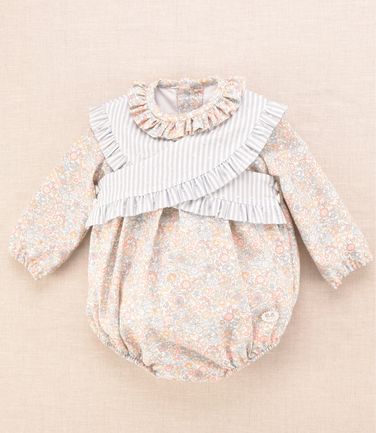 Pelele estampado liberty con detalle cuello cruzado de rayas en celeste.