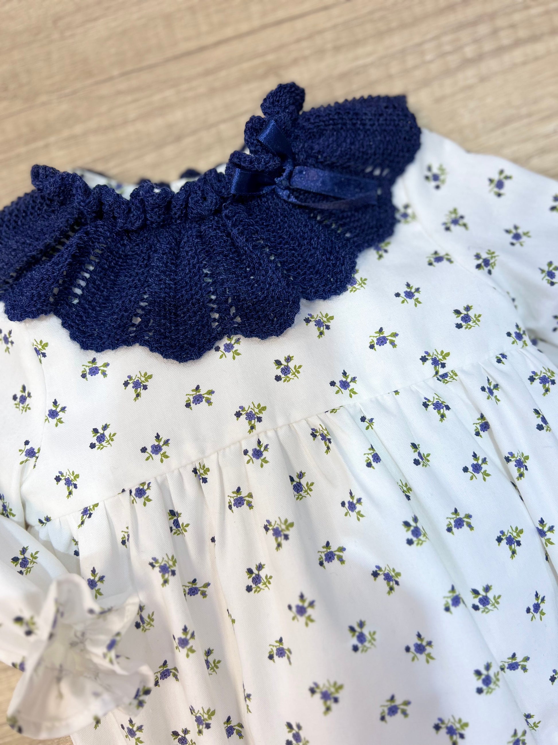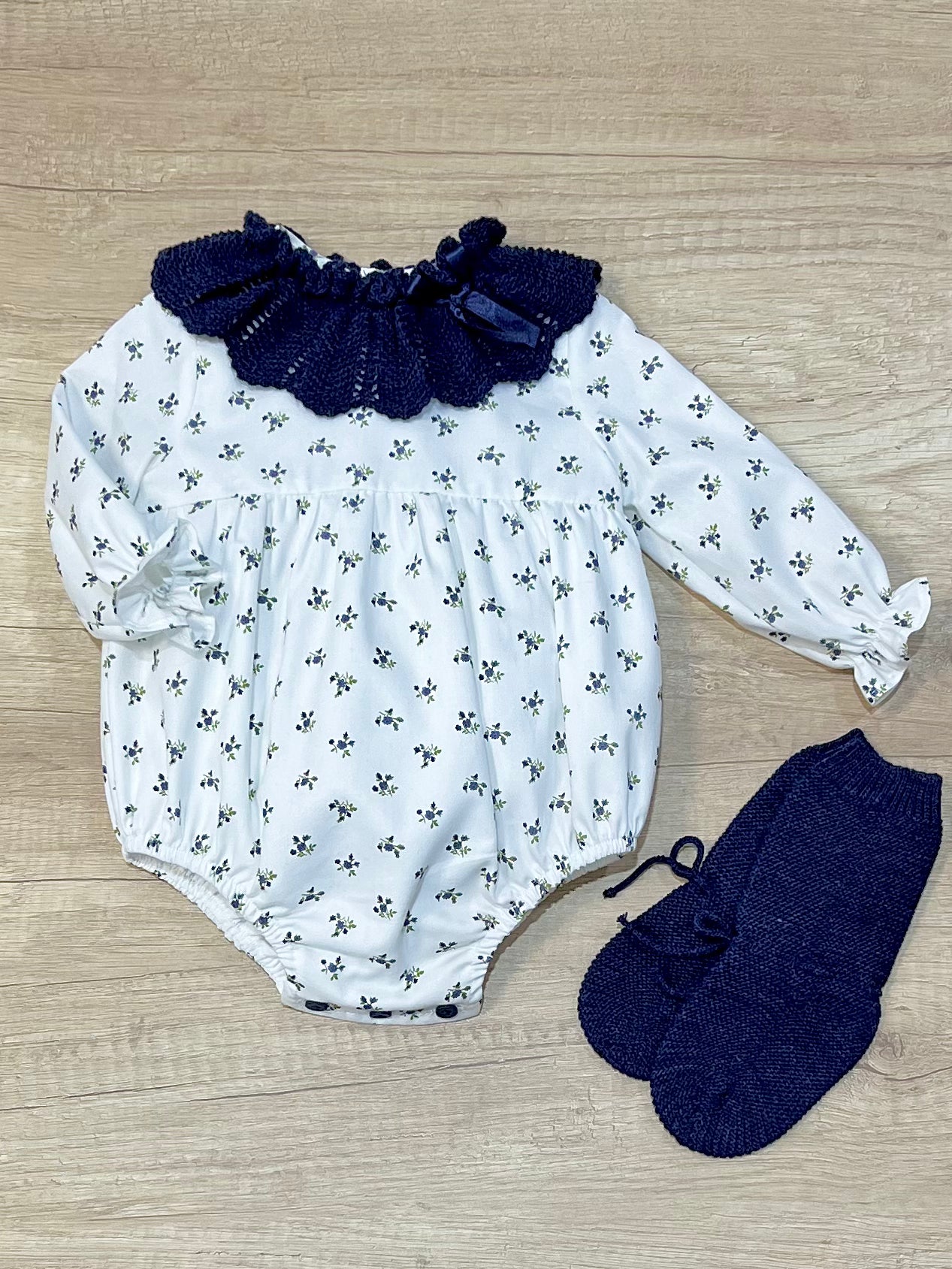 Pelele unisex, estampado en tono azul con cuello tricot.