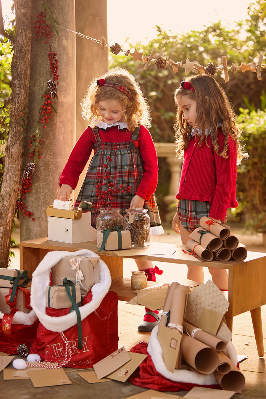 Pichi de falda amplia en tejido tartán gris, rojo y crudo. El cuerpo es de punto rojo, con cuello de tela blanco ribeteado en gris y detalle de pompones decorativos en el mismo tono.