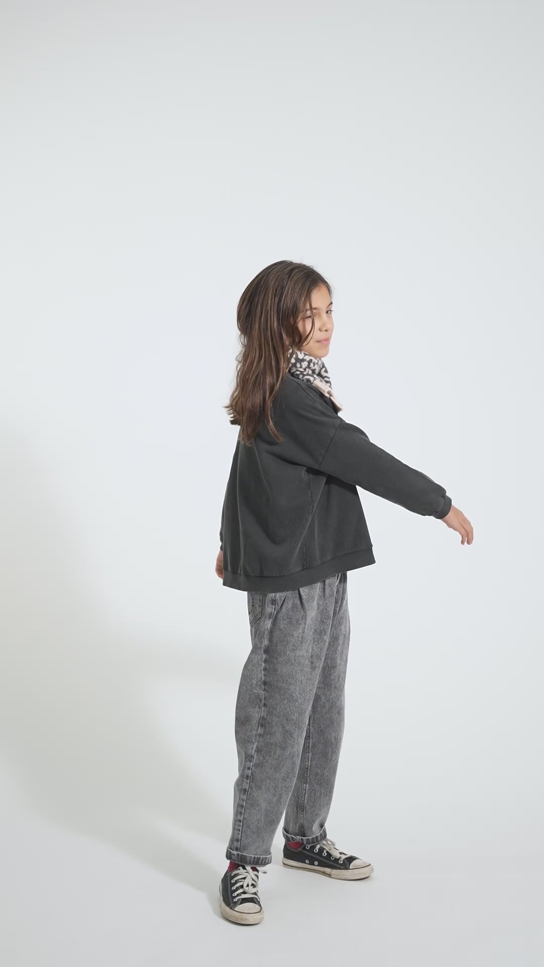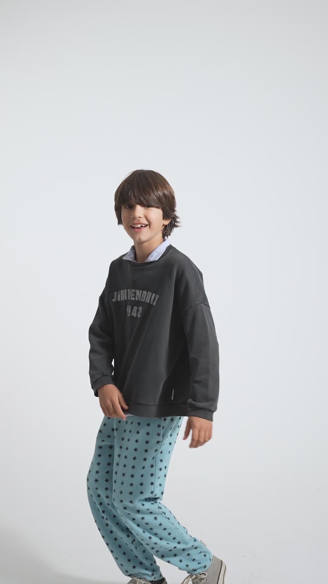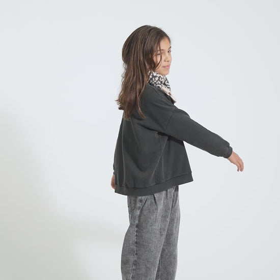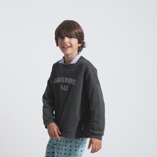 Sudadera unisex con estampado frontal y una pequeña estrella blanca en la espalda. Costuras decorativas. Forro polar de algodón orgánico cardado. Puños acanalados. Las tallas de bebé llevan botones en los hombros. Color/Tejido: negro desteñido | Forro polar de algodón orgánico cardado. Composición: 100 % algodón orgánico. Instrucciones de cuidado: Lavar en frío (máximo 30 °C). No usar lejía. No secar en secadora. Planchar a baja temperatura (máximo 110 °C). No lavar en seco. Hecho en Portugal.