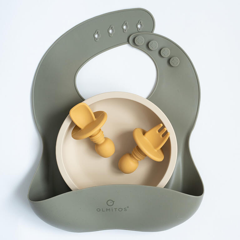 Silicona de alta calidad de grado alimenticio aprobada por LFGB. Cubiertos con formas redondeadas y suaves para evitar dañar la encía del niño.